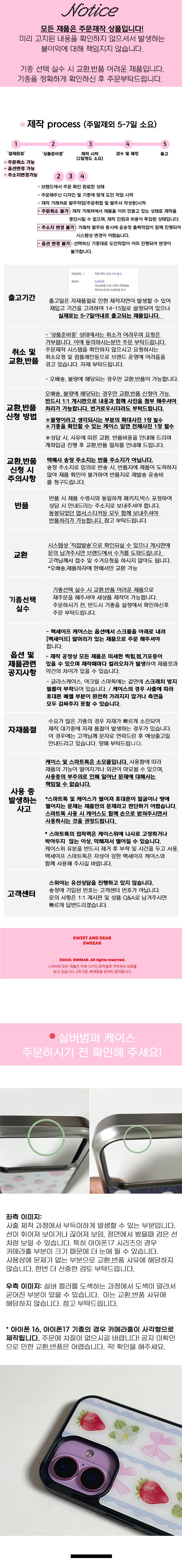 제작 진행중 자재가 품절하는 경우가 발생할 수 있어 이 경우는 개별적으로 연락드리고 있으며 추석연휴로 인해 제작량이 몰려 품절 기종이 계속해서 발생하고 있습니다. 아래 품절 기종 주문 시 출고까지 1~2주 소요될 수 있으며 계속하여 품절이 발생할 수 있습니다. 여유있는 주문 부탁드립니다.